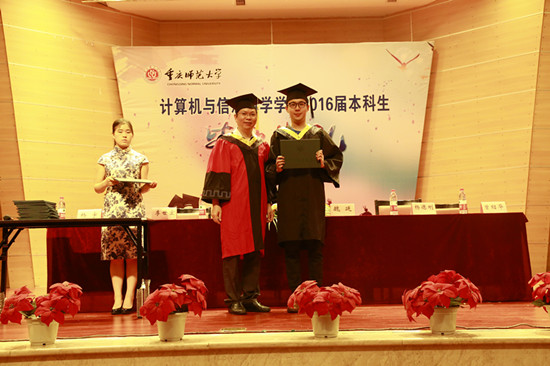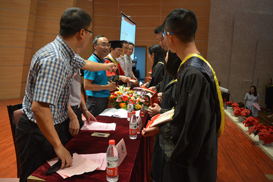 接下来,典礼进入表彰仪式。李世宏副院长为唐尚梅等27名优秀毕业生以及刘玉立等14名优良毕业生颁奖,其中张聪杰、张浩男、姚冠君、胡婕四名同学被推荐为重庆市优秀毕业生。紧接着杨德刚副院长宣读了给予第一志愿考取91自拍