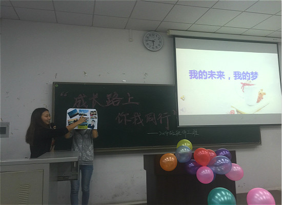 此次主题班会,学院在会前进行了充分的讨论,为此次主题班会奠定了“反思.分享.在路上”中心思想,制定了播放“点滴记录”视频、分享入学一年的收获以及制作心愿海报三个“规定动作”。班会伊始,各班播放了精心制作的班级同学自入校以来录制的成长记录视频,之后,各班邀请在过去一年中在学业、个人成长等方面卓有建树的同学上台分享了自己大学一年的收获与体会,分享自己寻找人生目标的心路历程。2014级软件工程班的李姝雨同学,分享了自己暑假参加英语培训、学习吉他、参加暑期社会实践的种种体会,展示了自己一年以来获得的各种证书和奖状,她以实际行动告诉班级同学,不要在迷茫中止步,人生的方向需要在行动中寻找。活动最后一个环节是各位同学展示自己制作的心愿海报,用自己寻找的图片贴出一份属于自己的愿景海报,去探寻自己内心深处对于未来人生的希望和目标。