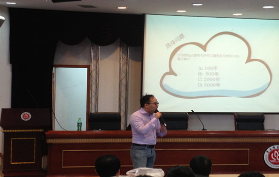杨水石先生曾在人和街小学、巴蜀中学、重庆市一中和复旦大学求学,本科毕业后到美国留学工作8年,曾任职微软西雅图总部。他用计算机数据相关问题作为本次讲座的开端,现场气氛非常轻松、活跃。接着,杨先生介绍了云计算的以下知识:云计算的三个特点,即快速分配资源、海量并行计算、广泛访问;云计算处理的数据是非常大的,云计算技术中心的规模也相当巨大;个人通过投资也可以建立小型的云计算服务中心达到创业的目的。不论是精美的PPT演示,还是谈笑风生的个人魅力,让同学们感受了杨先生的个人魅力。最后,杨老师本着激发师弟师妹学习积极性、寻找技术合伙人的目的向三位最先举手的同学分发了个人名片。