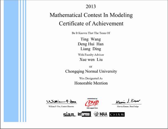 2010级信息管理与信息系统专业韩登辉、丁亮与数学学院2010级学生谢家慕妍、舒巧媛、李春燕、王婷、朱闪闪、张丹、张超等同学在数学学院赵克全、刘学文老师的指导下,摘得两个二等奖(Honorable Mention)、一个三等奖。其中,91自拍