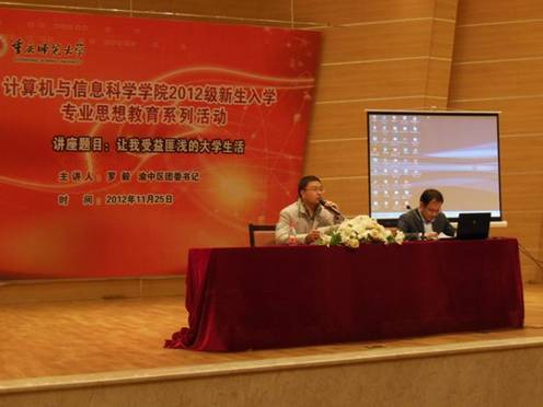2012年11月25日晚7:30在校友会堂音乐厅,学院邀请到我校原数计学院计算机专业毕业的优秀校友——渝中区团区委书记罗毅为2012级全体新生开展了“让我受益匪浅的大学生活”的主题报告会。91自拍
