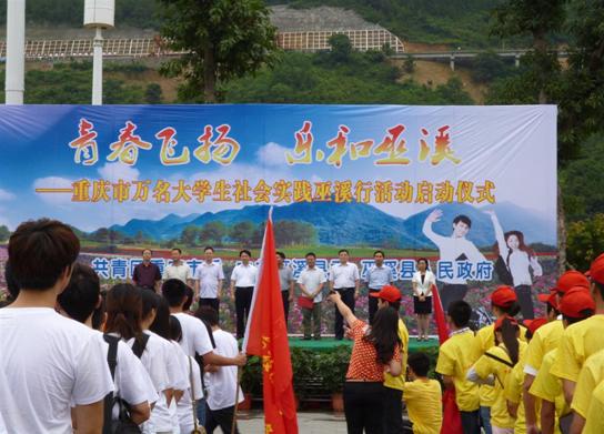 辅导员张敬跟随学校团委,于7月5日早上7:00和经济与管理学院其他4位辅导员、1名专业教师一同,带领全校182名学生历经十个半小时,到达重庆市巫溪县马镇坝新县城的逍遥广场,参加由重庆市团市委、巫溪县县委、县人民政府主办的巫溪“乐和家园”——重庆市万名大学生社会实践巫溪行活动启动仪式,作为本次活动第一批参加启动仪式的高校还有重庆大学、西南大学、西南政法大学、重庆邮电大学、重师大涉外商贸学院、重庆文理学院、重庆电子工程职业技术学院、重庆科技学院、长江师范学院、三峡职业技术学院等十余所高校,略计1500余人。巫溪县委、县府领导、团市委领导致辞、高校代表发言,傅长波副县长主持。随后根据分组情况,我校实践服务团奔赴巫溪县塘坊镇各乡村开展活动。