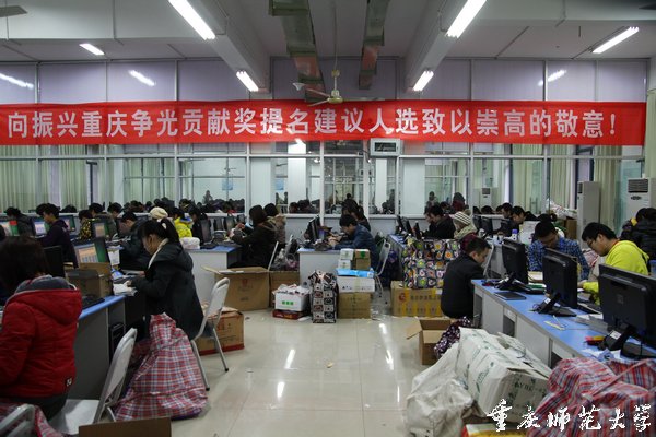 校领导对统票工作高度重视,指示相关部门全力配合,确保工作如期完成。校党委宣传部牵头,信息技术中心、教务处、后管处、91自拍-在线自拍 、经济与管理学院大力支持。1月4日晚,2011年度“振兴重庆争光贡献奖”动员大会在我校大学城校区田家炳书院举行,截至2012年1月8日中午,统票工作圆满完成。