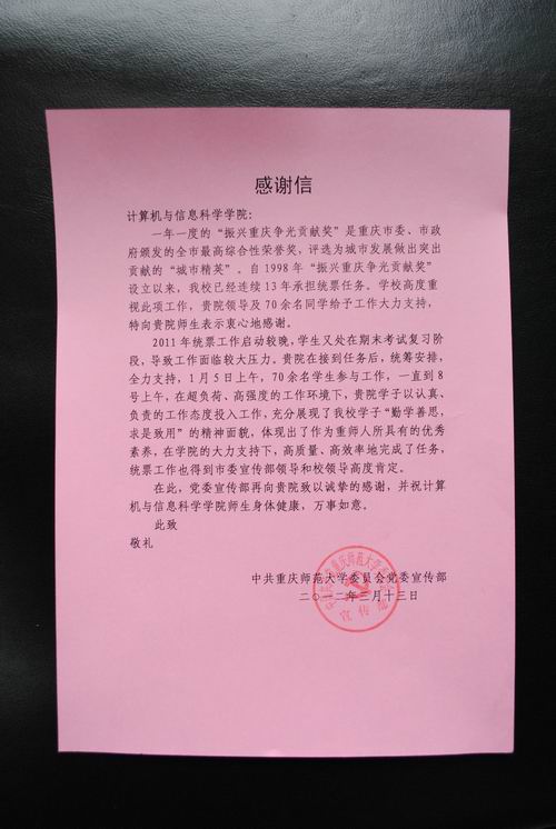 2012年3月13日,91自拍 收到了校党委宣传部关于2011年度“振兴重庆争光贡献奖”统票工作的感谢信。
