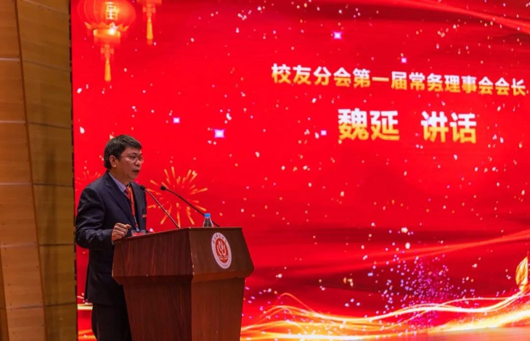 院长、新任分会会长魏延上台致辞。他首先代表学院对各位领导、前辈和校友重聚母校表示热烈欢迎和诚挚感谢。对今后校友分会的工作,魏院长提出了三点想法:筑牢理想信念基础,增强领导班子做好校友工作的责任感、使命感;锤炼分会工作技能,推动后续工作快速展开;畅通校友沟通渠道,形成全员上下、内外联动的校友工作格局。