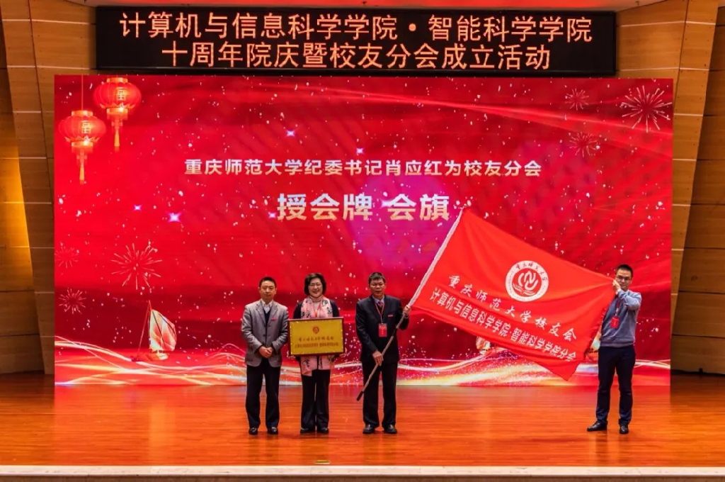 紧接着,重庆师范大学纪委书记肖应红、校友总会秘书长李科相继上台为校友分会第一届理事会颁发聘书,为分会授会旗、会牌。