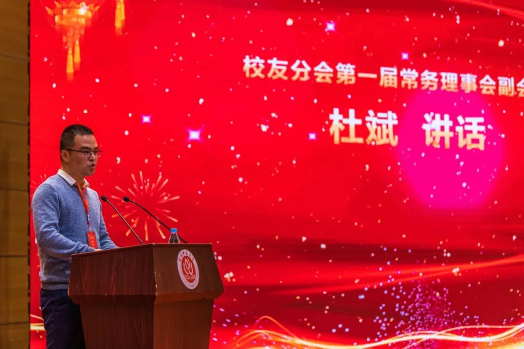 校友代表、分会副会长杜斌上台讲话,他谈到计信学院作为作为我校最年轻的学院,要以分会成立为契机,弘扬优良建院传统,夯实发展根基,把握发展机遇,重整行装再出发。校友工作班子将不负重望加强校友分会组织建设,促进校友之间、校友与母校之间的感情联络。
