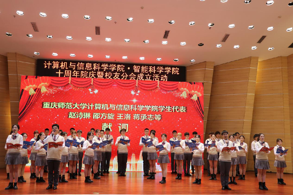 接下来,学生代表上台献词,计信学子声情并茂地表达了学院的深情与祝愿,博得台下阵阵掌声。紧接着,2012级计算机科学与技术专业学生刘玉立作为毕业生代表表达了对学院领导老师悉心培育的感激之情以及对学院未来发展的美好憧憬。重庆计算机学会秘书长曾一教授、南京师范大学计算机与电子信息学院院长吉根林教授、腾讯教育高校产品总经理钱栩磊先生上台致辞,表达了对计信学院十年生日的祝福,并表示将加深校企合作,助推学院发展。同时,91自拍