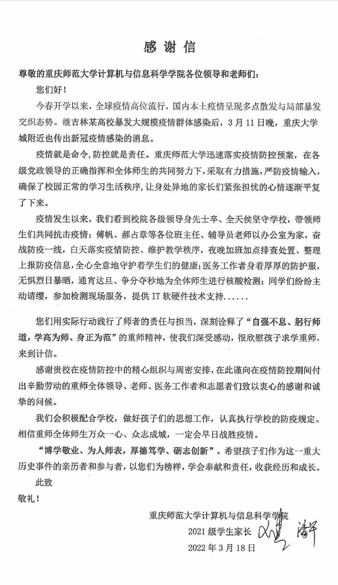 截至3月20日,学校已开展4次全员核酸检测,全校均为阴性。学院线上教学活动正常开展,学生们认真学习,精神状态良好。同时,各年级辅导员在年级家长群通过图片、视频、文字等加强与家长的沟通联系,学院发布《给家长朋友们的一封信》,让广大家长知悉学院工作,共筑抗疫力量。令人欣慰的是,学院工作得到了家长朋友的一致好评和大力支持,家长们纷纷以各种形式表达对学院领导、老师们的感谢和慰问。2021级计算机类3班王颢潼学生家长,还专门来信感谢学院所做的工作。