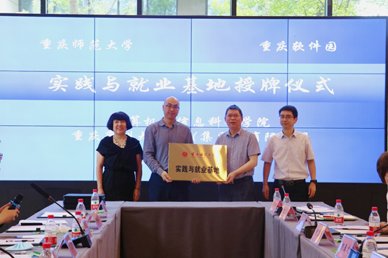 魏延院长介绍了学院的历史沿革、办学理念和发展情况。他谈到,当前,学院正在开展访企拓岗专项工作,充分了解行业的发展状况,调研企业的实际需求,开拓学生的就业渠道,从而优化人才培养方案,提高人才培养质量,促进学生更高质量就业。他希望学院与重庆软件园的这次对接能有效促进校企之间的深度合作。随后,魏延院长代表学院向重庆交运城卡科技有限公司、重庆康洲大数据(集团)有限公司,授予“实践与就业基地”牌匾。