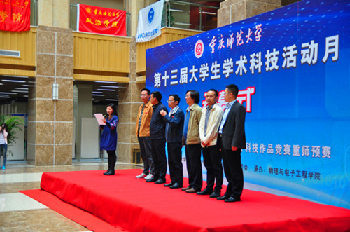 参加了第十三届“大学生学术科技活动”的开幕式暨第十四届“挑战杯”全国大学生课外科技作品竞赛预赛。此次活动是由重庆师范大学第十三届大学生学术科技活动月组委举办,由物理与电子工程学院承办的。出席本次科技活动月开幕式的有:副校长杨新民老师、校党委宣传部副部长王军老师、学生处处长张明志老师、研究生院万伦老师、各院分管学生工作副书记、团总支书记、学生科技活动指导教师和学生代表等,主持人由高菁励老师担任。