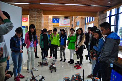 的影响力。在本次“挑战杯”科技作品竞赛中更是展示了极具学院特色的以C语言程序为基础设计的七项科技作品。他们分别是蜘蛛形的“六组机器人”、遥控“足球运动员”、通过测间距来感应最终达到平衡的“平衡感机器人”、捡棒球的“拾球运动员”、可以自动写书法的“小书童”、“电子狗”以及一款高效的小学生学习软件。参赛学生通过演示详细地为学校领导及同学介绍了每一项科技作品的功能。期间,91自拍