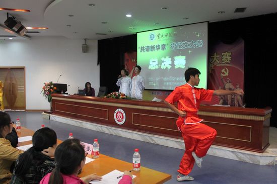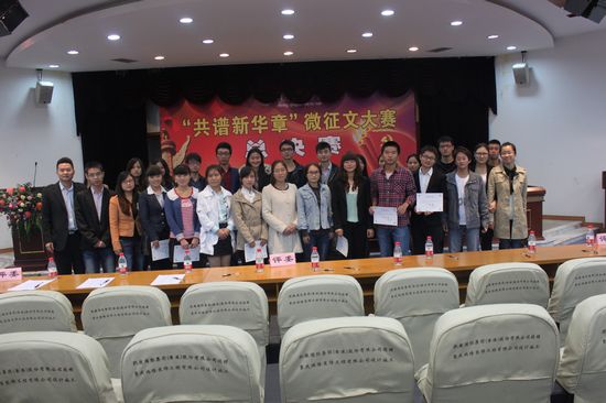 本次微征文大赛的主题是“喜迎十八大,共谱新华章”,经过15个团队的激烈的角逐,文学院的沈盼同学带领团队用娴熟的配乐演讲与歌唱技巧深刻诠释了其微征文作品——“在党的光辉照耀下,新中国走过的光辉之路”,夺得一等奖;计信学院常晨、文学院阴晓旭、体育学院钟悦祺获二等奖;化学学院蔡腊梅、数学学院傅前俊、教育科学学院李念婷、物理与电子工程学院廖平、文学院梁沁沁获三等奖,其他选手分获优秀奖。