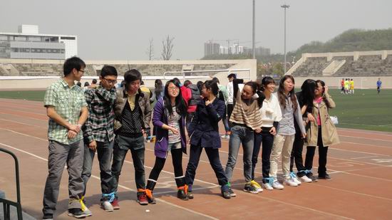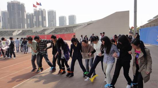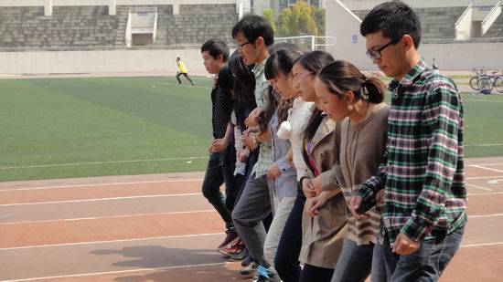 2011年3月25日下午1:00,远远的就听见重师足球场高高的口号声,球场内的同学们十人一组,十个人的脚都用纱巾两两绑在一起成一排向前走,每组的成员有男有女。各个组的成员脸上洋溢着青春的激情,每个组的同学们都在练习走路,口号齐声震天。原本是与生俱来的能力却在需要十个人共同完成的时候变成一个难题,这也考验着青马学员的组织能力和凝聚力。